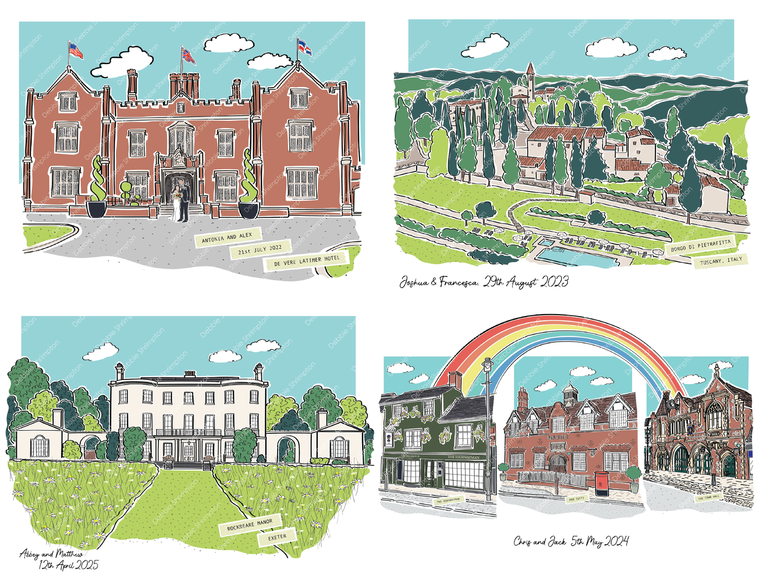 Allow me to create the most beautiful bespoke wedding or anniversary gift, an illustration of your wedding venue scribed with your names and wedding date. Send me a photo of the venue from your favourite angle. I will work with you to offer suggestions to create the best composition relevant to your day.