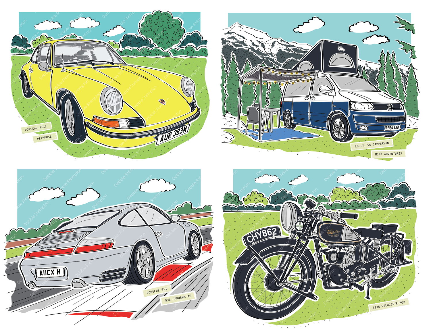 Commission me to illustrate your loved car, campervan, motorbike from your favourite photo. Take a photo to show off the best angle for detail. Choose from a background of bushes & fields, mountains, race track or ask me to draw a location of your choice.