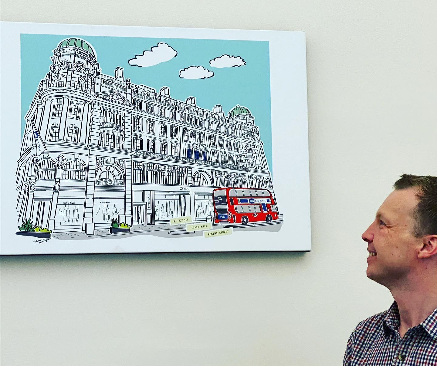 I can offer a range of illustrated items, including enamel keyrings, pin badges, tote bags and ceramic Christmas baubles featuring recognisable venues. For something more impactful, I also create large-scale illustrations on canvas that can be displayed as striking wall art in offices or reception areas.