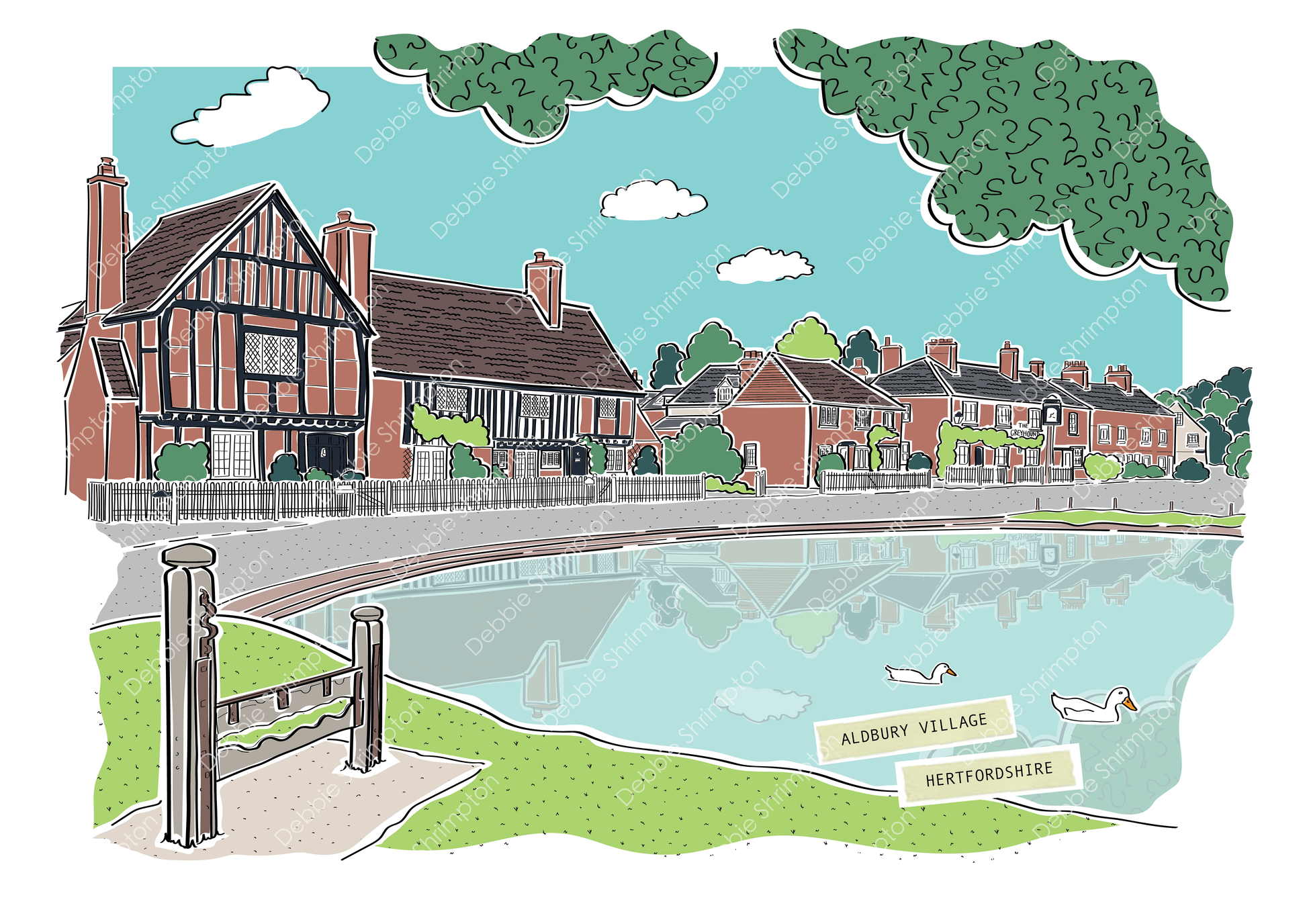 An illustration capturing the picturesque historic village on the edge of the Ashridge forest within the Chilterns Area of Outstanding Natural Beauty. Reflections can be seen on the iconic pond of the historic buildings and Greyhound pub.