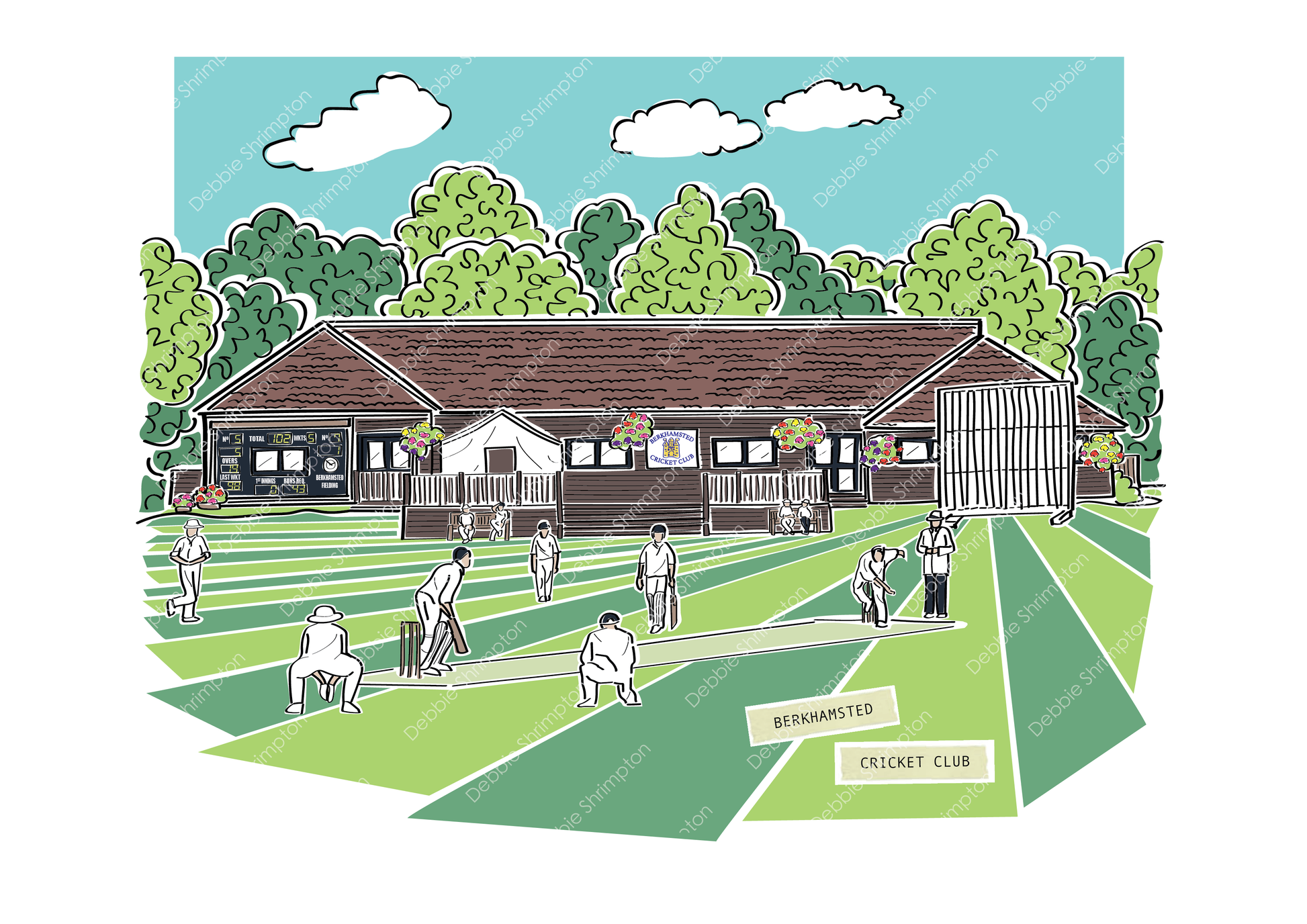 In a fabulous valley setting Berkhamsted Cricket Club is a much loved venue for Cricket, parties and events with views across the Berkhamsted countryside. This illustration captures the loved venue, the action of the match and the lovingly mowed cricket pitch.