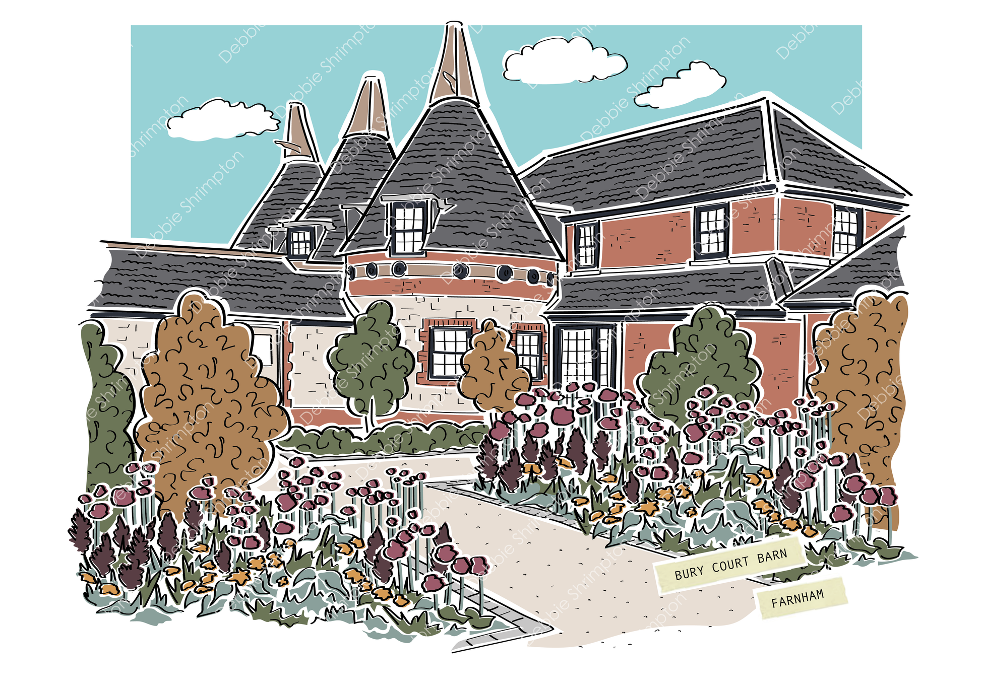 Bury Court Barn Farnham illustrated with Autumn colours to suit your Autumn wedding. The illustration can be personalised to suit your wedding or event.