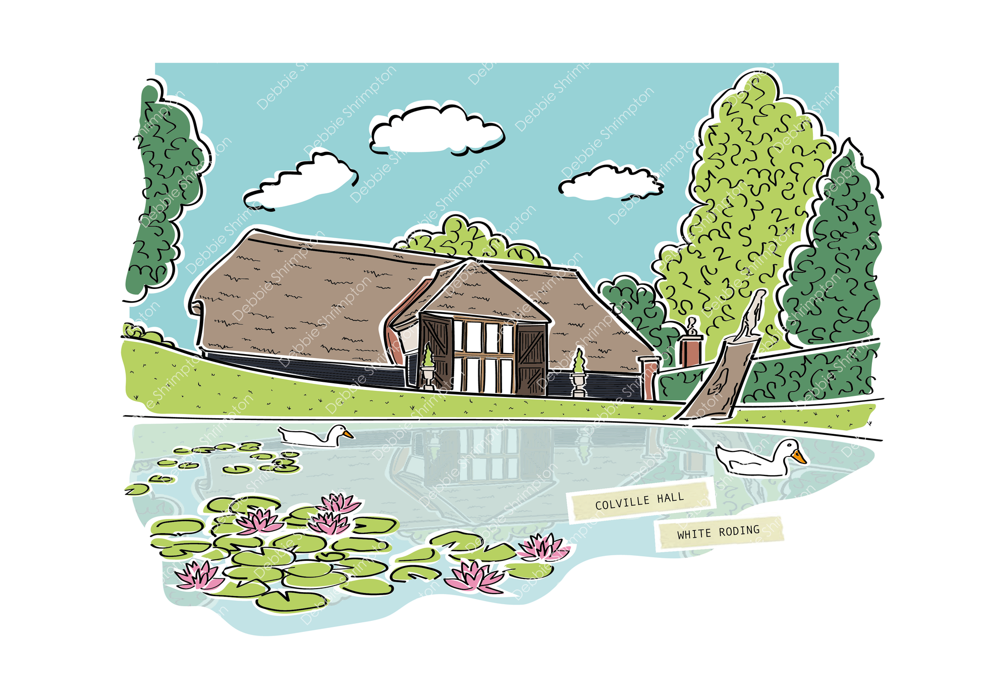 Colville Barn Wedding Venue, Colville Hall is located in the lovely village of White Roding on the Hertfordshire / West Essex border, illustration of the stunning wedding venue is the perfect bespoke wedding gift.
