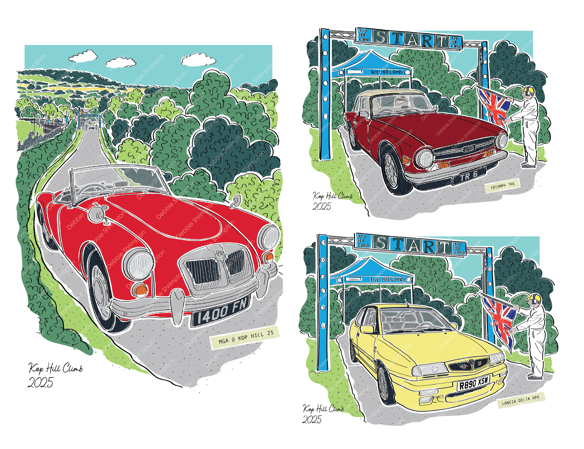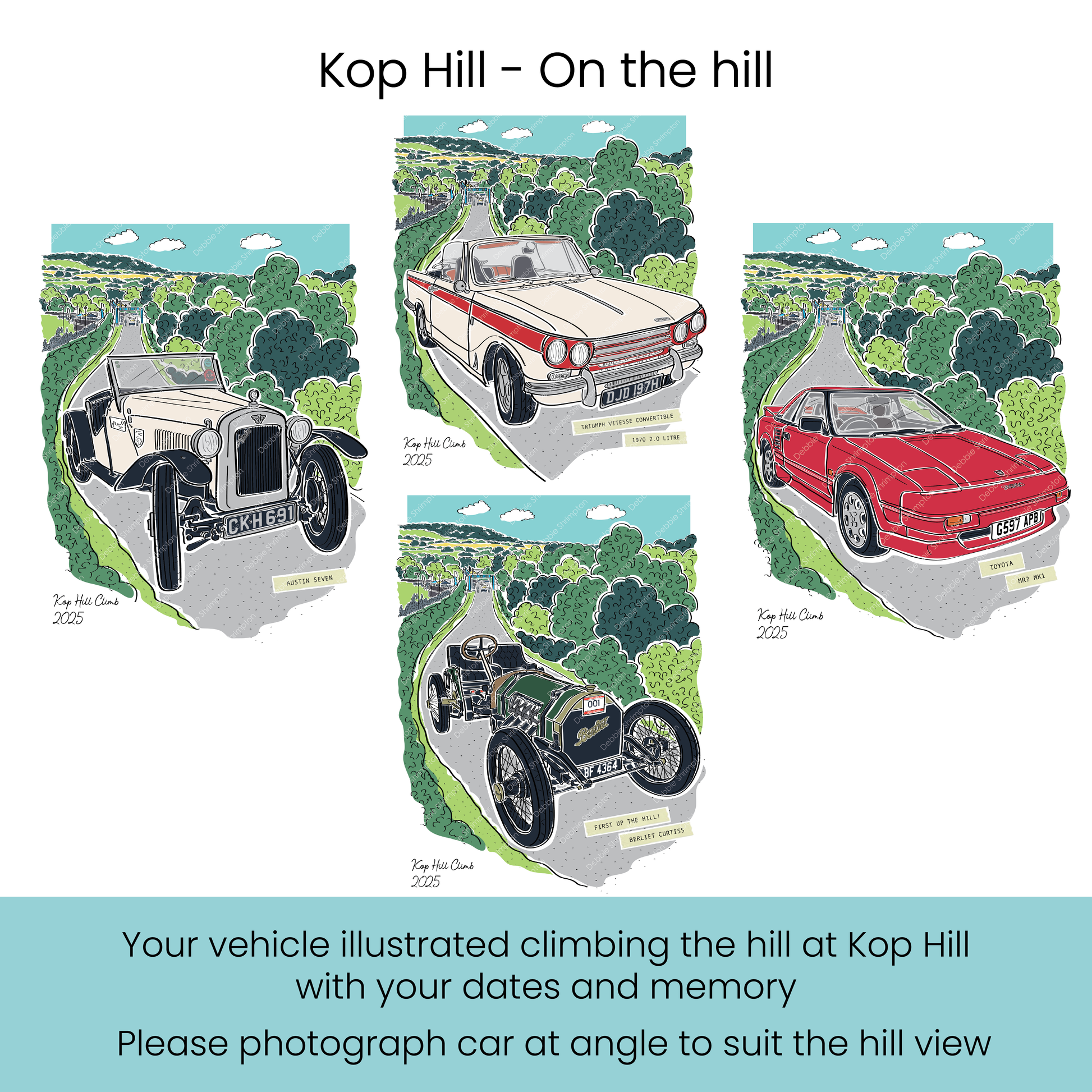 Commission me to illustrate your car or loved vehicle at the Kop Hill Startline or climbing the famous Kop Hill Climb, capturing your date and memories.