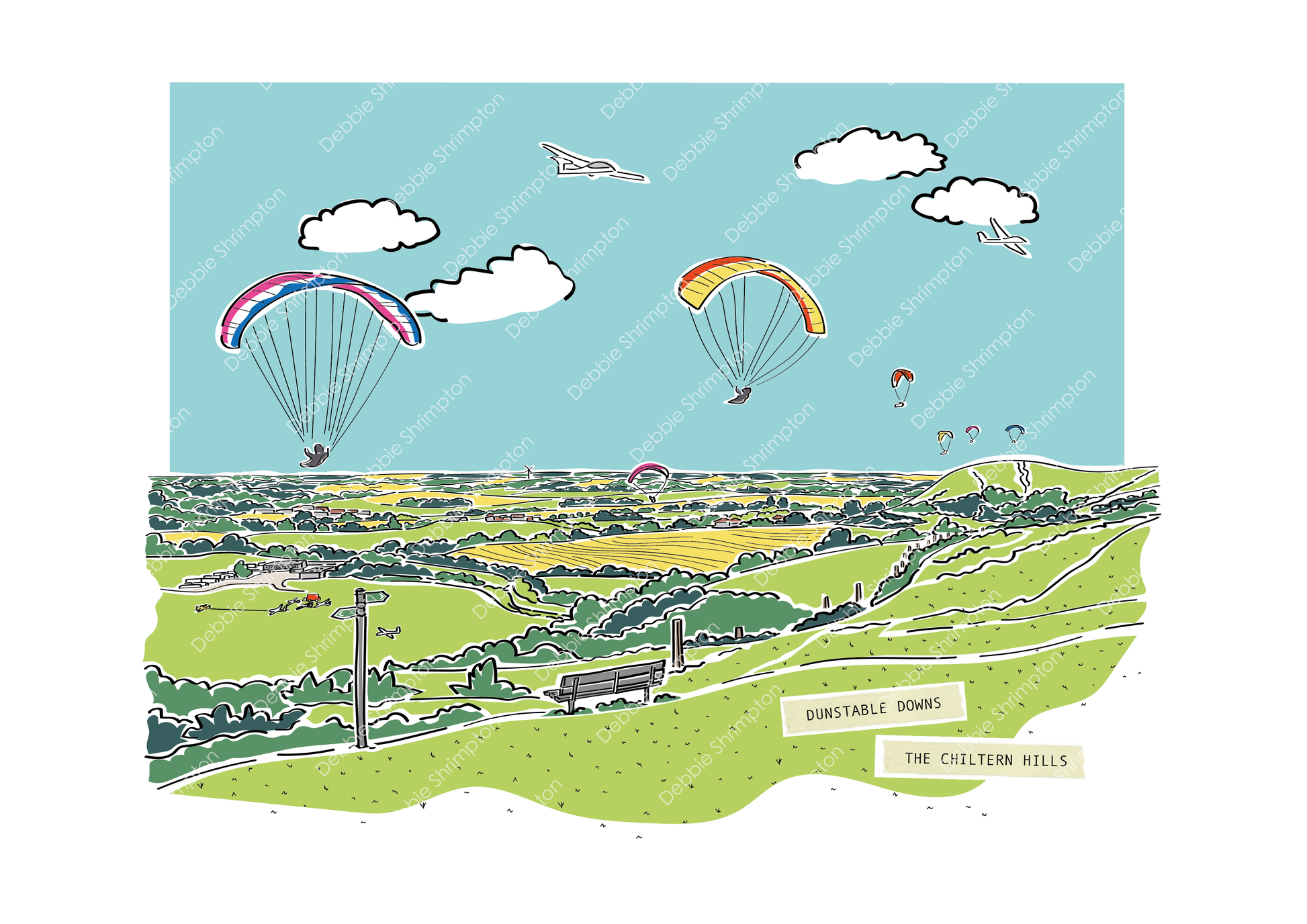 An illustration capturing the breathtaking view from Dunstable Downs with the Paragliders and Gliders filling the skies