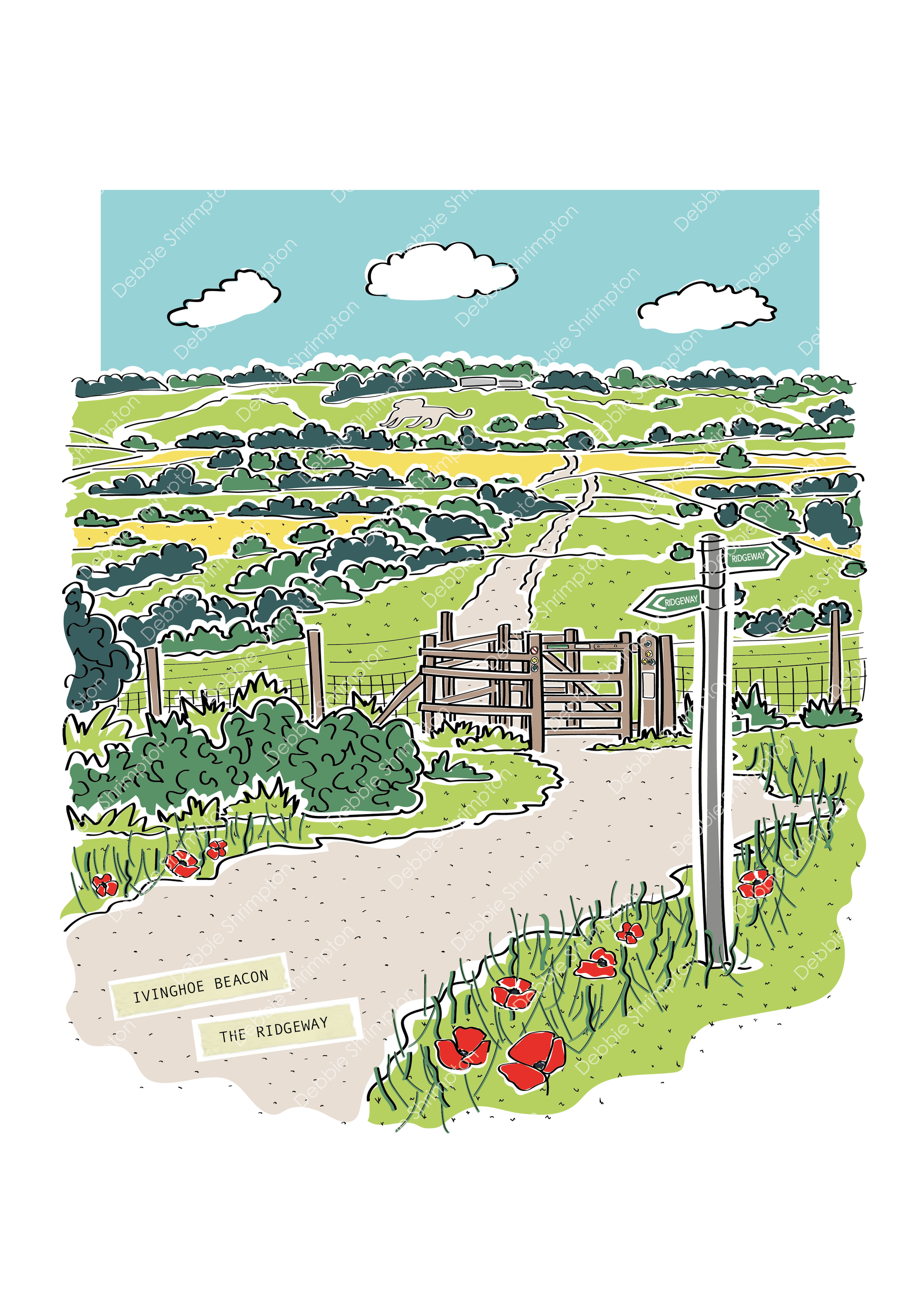 An illustration capturing the breathtaking view from Ivinghoe Beacon with the Whipsnade Lion in the carved into the chalk Chiltern Hills.
