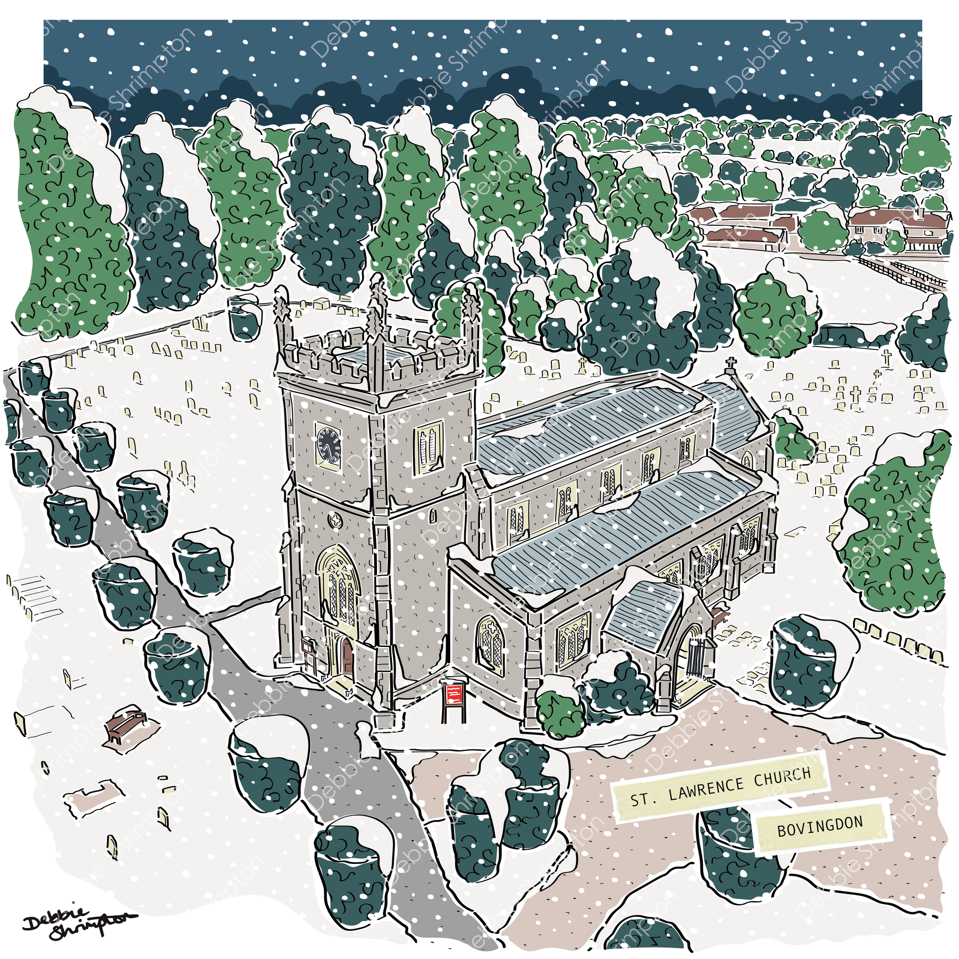 St Lawrence Church Bovingdon illustrated in Winter by Debbie Shrimpton Illustrates.