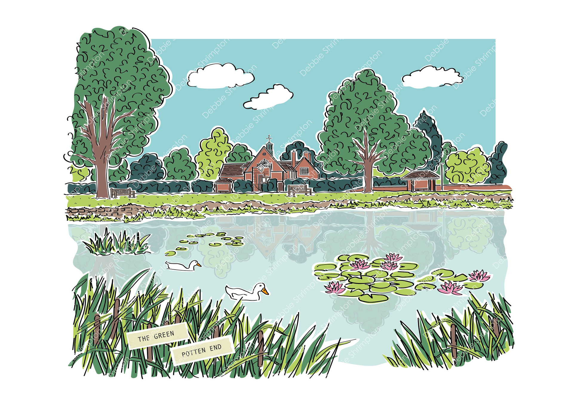 The Green at Potten End, illustrated by Debbie Shrimpton Illustrates. The centre of the Potten End Village with views of the pond and Village Hall.