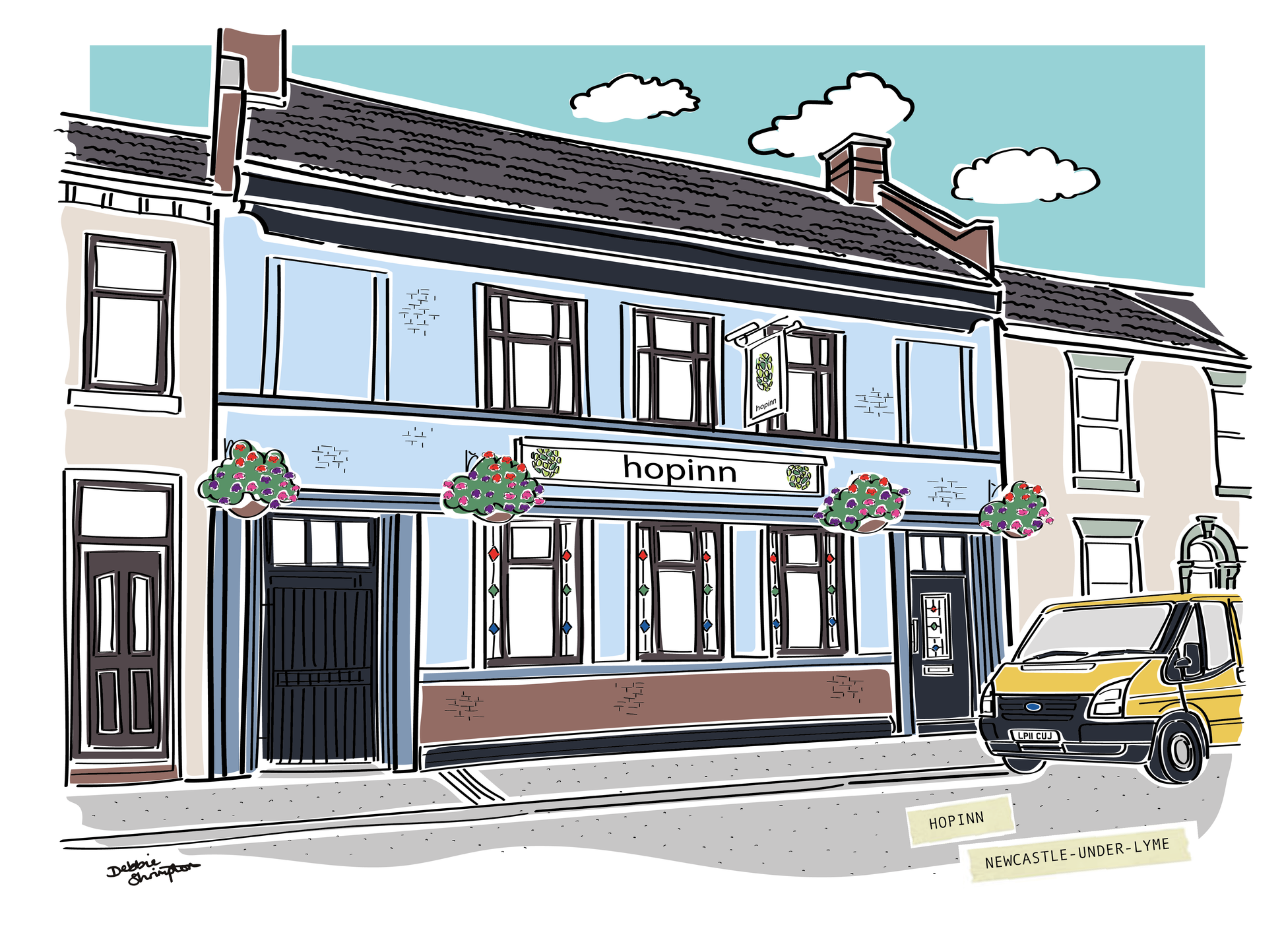 An illustration capturing the loved Hop Inn Pub in Newcastle under Lyme, Staffordshire